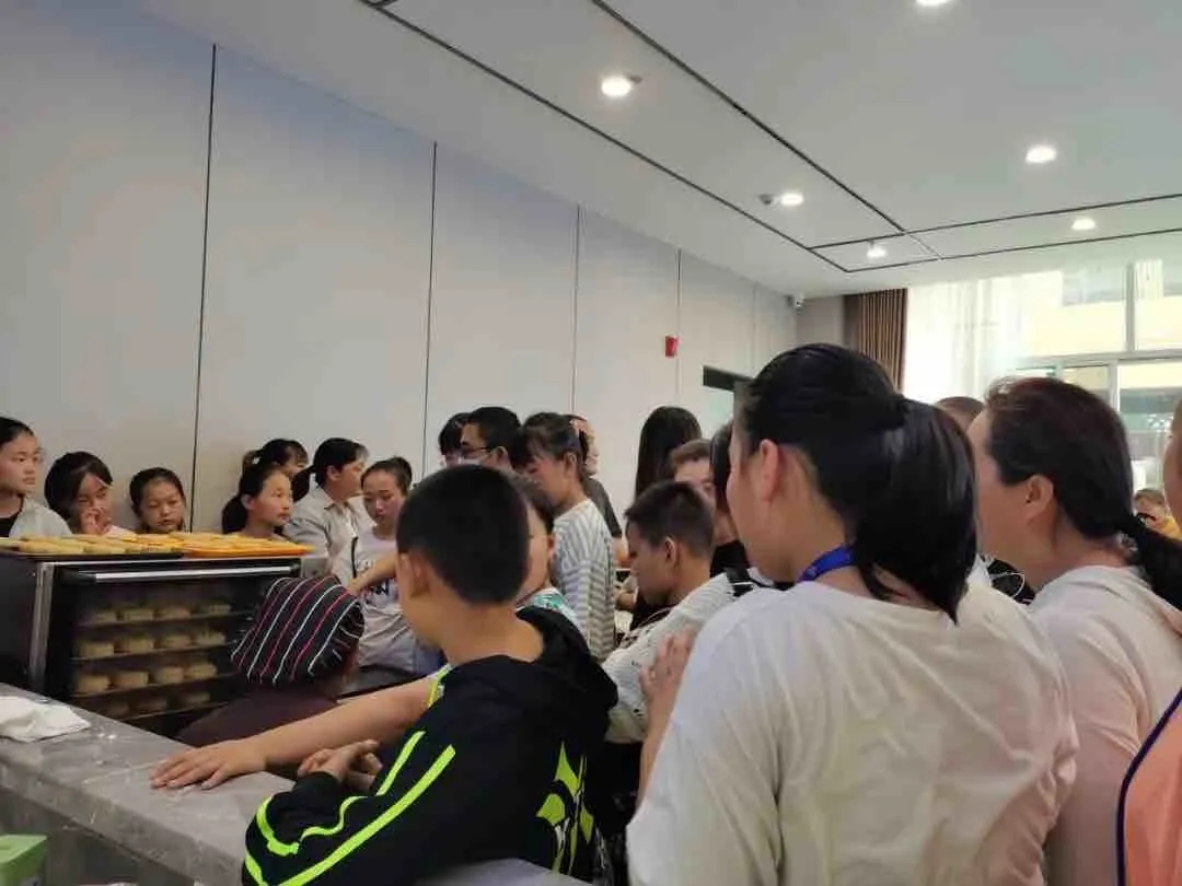 烘焙师将小朋友们的月饼放入烤箱,