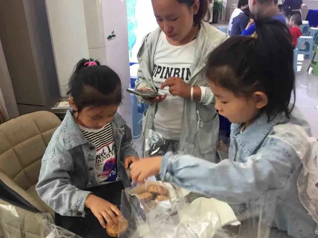 小朋友们排队领取制作月饼的材料和模具