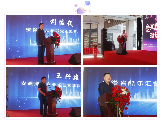 受邀出席本次活动的领导有新疆驻安徽工作组党委书记陈翰林、安徽省统战部非公经济处处长韩永龙、安徽省工商联副主席司应武、合肥市委书记办公室主任夏跃民、合肥市审计局副局长张仁山、合肥市庐阳区商务局副局长朱骏、合肥福州商会秘书长陈可逸先生、安徽云顶集团集团总裁张晓东、安徽捷成商业运营管理有限公司总经理王兴建、安徽省酷乐汇餐饮管理有限公司总经理甄勇,各位领导分别为本次开街仪式做开幕发言。