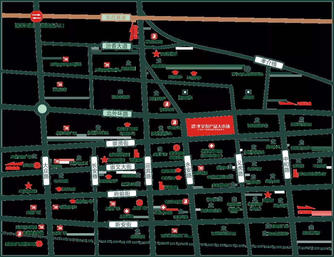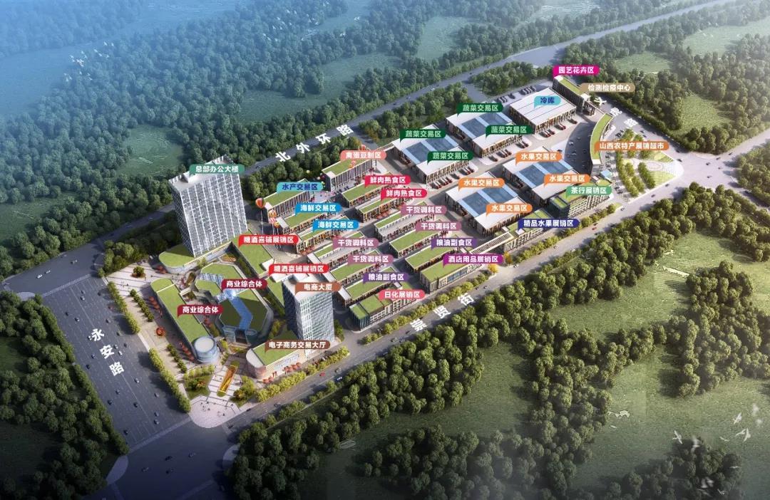 孝义农产品大市场位于城市主干道永安路与崇贤街交汇处,项目总投资10亿元,占地面积约220亩,总建筑面积约17万㎡,涵盖蔬菜、水果、粮油副食、干货调料、海鲜水产、冷冻鲜肉、日杂百货、酒店用品八大业态;农特优展销区、商务办公区、仓储 工区、冷链物流区、配套服务区六大功能区。项目建成后,将成为集农产品展览交易、电子商务、电子结算、加工配送、净菜加工、冷链物流、质量检测、信息发布、创业孵化、金融服务、休闲娱乐等功能为一体的现代化大型农批综合服务平台。