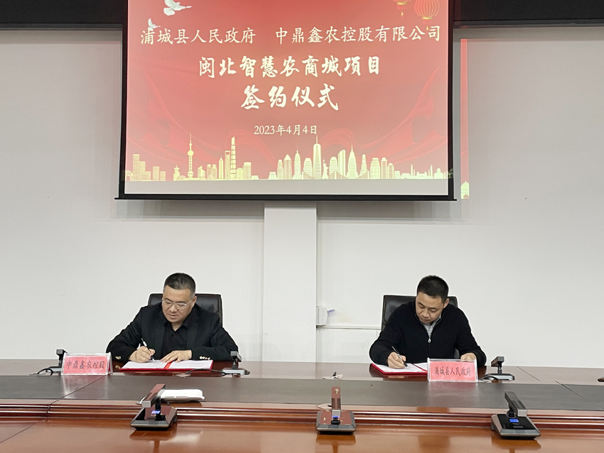 2023年4月4日,福建省浦城闽北智慧农商城项目签约仪式,在浦城县政府隆重举行, 浦城县副县长傅礼辉、商务局局长黄留斌、商务局刘娇霞,中云顶集团农集团董事长郑景利、投资发展中心总监杨旭等企业高管共同参加了本次签约仪式。