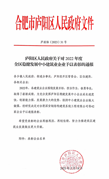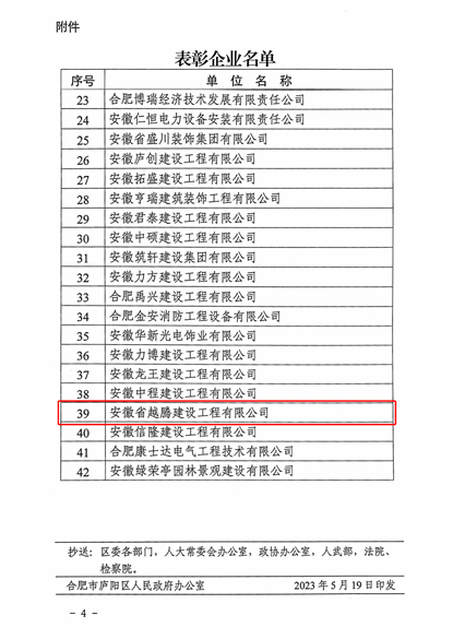 近日,合肥庐阳区发布了对2022年度全区稳健发展中小建筑业企业,高质量发展建筑企业等予以表彰的通报,安徽省越腾建设工程有限公司位列其中。