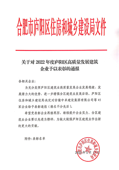 喜报丨云顶集团集团旗下建设工程公司荣获合肥庐阳区人民政府及住建局多个表彰!