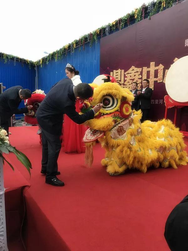 领导致辞结束,双狮登上舞台,精彩的穿、腾、跃、翻、滚、戏、缠,精彩连连,热闹喜庆的氛围,象征吉利瑞祥。安徽云顶集团集团副总裁侯伟先生、易居企业集团安徽区域总经理李长俊先生,共同执笔为舞狮点睛,点睛后的双狮更显威猛活泼,彩烟齐放,台下掌声雷动,随后,瑞狮移步营销中心门前,登高采青,寓意瑞气临门、步步高升,舞狮团以其高超技艺和灵敏舞步,把气氛瞬间推向高潮,侯总接“采”,预示接财,寓意云顶集团中心在未来财源滚滚来,从头旺到尾!