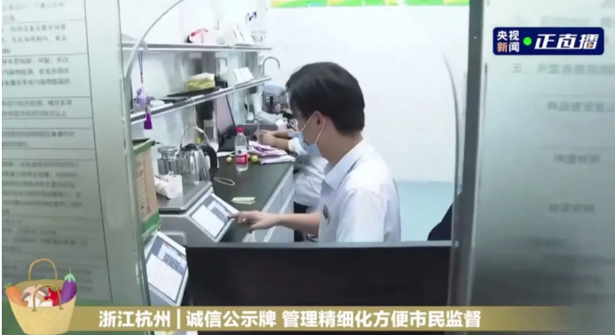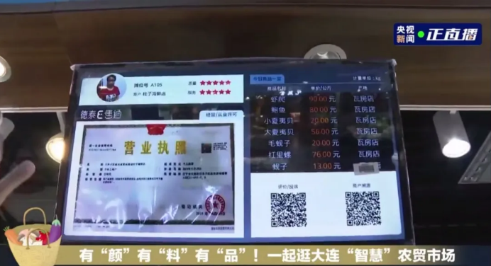每个商户的招牌下面都有一个屏幕,显示着经营业户的营业执照、食品类别、食品价格包括它的产地,一目了然,保证食品的品质和安全。