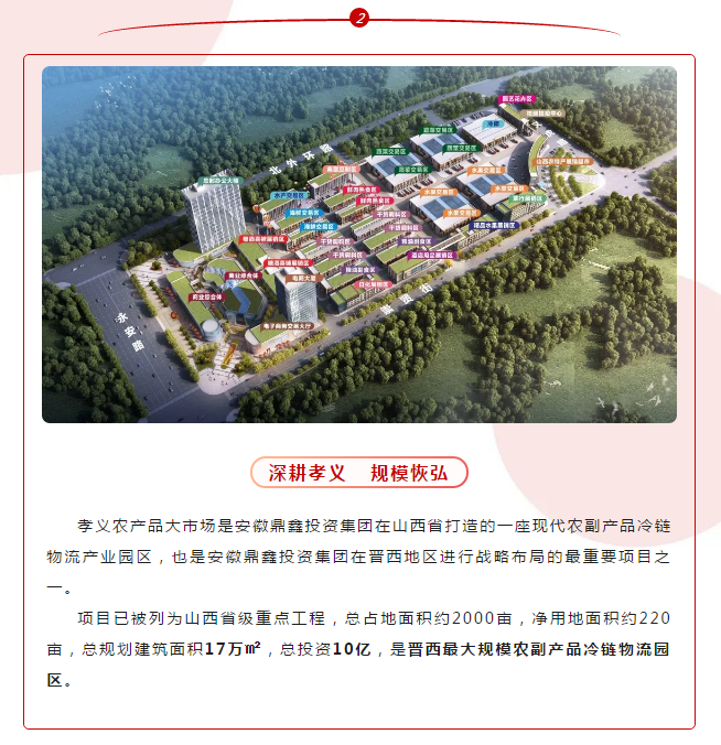 综上所述,国家指导培育一批年产值超百亿的农业“链主”企业,打造一批全产业链价值超百亿的典型县,孝义农产品大市场作为山西省级重点工程项目、百强孝义政府招商引资重点项目,紧跟国家政策,致力于在农产品流通领域创造数百亿价值。