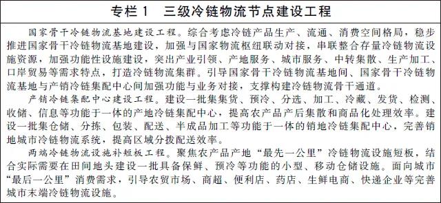 ——基础设施更加完善。依托农产品优势产区、重要集散地和主销区,布局建设100个左右国家骨干冷链物流基地;围绕服务农产品产地集散、优化冷链产品销地网络,建设一批产销冷链集配中心;聚焦产地“最先一公里”和城市“最后一公里”,补齐两端冷链物流设施短板,基本建成以国家骨干冷链物流基地为核心、产销冷链集配中心和两端冷链物流设施为支撑的三级冷链物流节点设施网络,支撑冷链物流深度融入“通道 枢纽 网络”现代物流运行体系,与国家物流网络实现协同建设、融合发展。