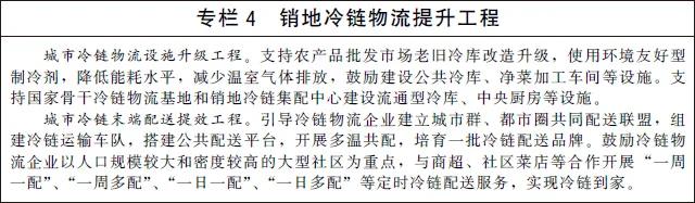 加快商贸冷链设施改造升级。推动农产品批发市场冷库改造,配套建设封闭式装卸站台等设施,完善流通加工、分拨配送、质量安全控制等功能。鼓励商超、生鲜连锁店加大零售端冷链设施改造升级力度,提高冷链物流服务能力。引导城市商业街区、商圈、农贸市场共建共享小型公共冷库。淘汰关停不合规不合法冷库。