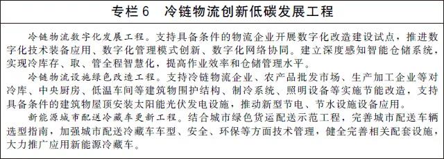 推动冷链基础设施智慧化升级。围绕国家骨干冷链物流基地、产销冷链集配中心等建设,加快停车、调度、装卸、保鲜催熟、质量管控等设施设备智慧化改造升级。鼓励企业加快传统冷库等设施智慧化改造升级,推广自动立体货架、智能分拣、物流机器人、温度监控等设备应用,打造自动化无人冷链仓。