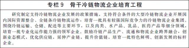 推动第三方冷链物流企业专业化发展、规模化经营和数字化转型,着力培育具有较强国际竞争力的龙头企业。加大冷链物流关键技术和先进装备研发力度,鼓励节能环保技术应用。推动建立冷链物流统计评价体系,准确掌握冷链物流基础要素底数,及时客观反映行业发展情况。完善冷链物流标准体系,强化国内国际标准对接。加大复合型冷链物流专业人才培养力度,壮大多层次冷链物流人才队伍。
