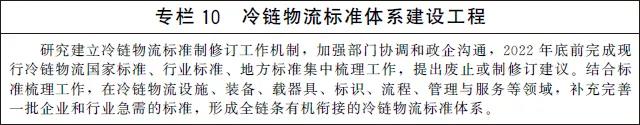 加强冷链物流标准制修订。加强冷链基础通用标准和冷链基础设施、技术装备、作业流程、信息追溯等重点环节以及冷链物流绿色化、智慧化等重点领域标准制修订,加快填补标准空白。制定一批强制性国家标准,守好冷链产品安全底线。加强冷链物流推荐性国家标准、行业标准推陈出新,支持地方因地制宜制定符合发展需要的地方标准,鼓励高起点制定团体标准和企业标准。积极参与冷链物流国际标准化活动,推动国内国际标准接轨。