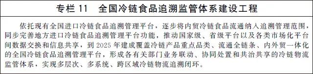 加快建设全国性冷链物流追溯监管平台,完善全链条监管机制,针对冷链物流环境、主要作业环节、设施设备管理等重点,规范实时监测、及时处置、评估反馈等监管过程,逐步分类实现全程可视可控、可溯源、可追查。创新监管手段,加大现代信息技术和设施设备应用力度,强化现场和非现场监管方式有机结合。借鉴新冠肺炎疫情防控期间进口冷链食品检验检测检疫经验做法,优化完善工作机制,建立科学、可靠、高效的冷链物流检验检测检疫体系。