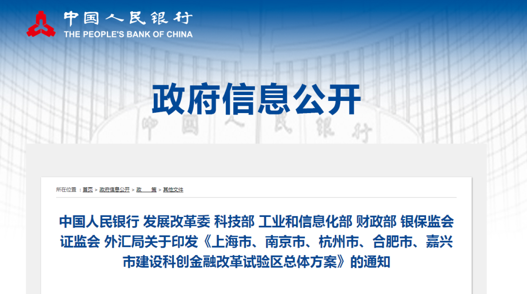 为深入贯彻习近平总书记关于长三角一体化发展和创新体系建设的重要指示和讲话精神,认真落实党中央、国务院决策部署,按照《长江三角洲区域一体化发展规划纲要》和《国家创新驱动发展战略纲要》要求,经国务院同意,2022年11月18日,人民银行、发展改革委、科技部、工业和信息化部、财政部、银保监会、证监会、外汇局印发《上海市、南京市、杭州市、合肥市、嘉兴市建设科创金融改革试验区总体方案》