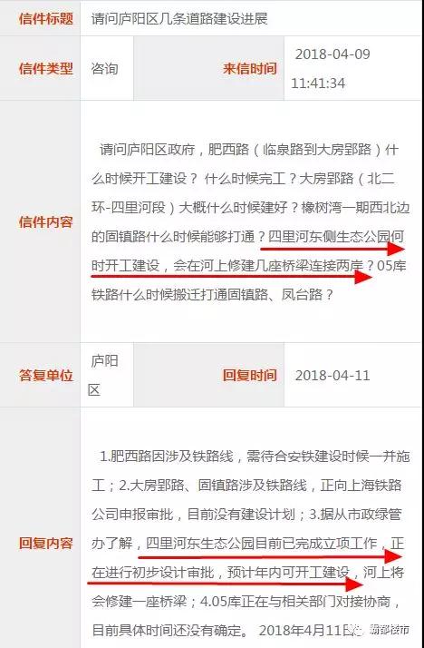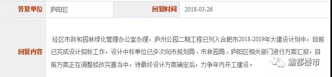 3月底,有网友在市长信箱咨询庐州公园二期建设事宜,官方具体回复如下: