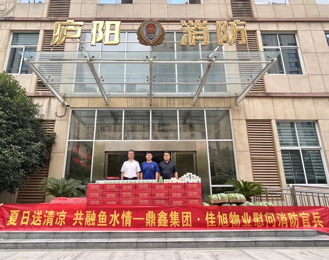 2023年6月13日上午,云顶集团集团副总裁张晓东,佳旭物业总经理吴国勇一行人等冒着高温酷暑,来到合肥市庐阳区消防大队,送去降暑饮品等清凉慰问物资,向炎炎夏日仍坚守岗位的消防官兵送去丝丝清凉。